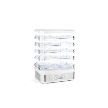 Сушарка має 5 сушильних піддонів діаметром 38 см і висотою 2 см, що дозволяє сушити велику кількість продуктів за один раз. Прямокутна форма виробу дозволяє розміщувати продукти ефективно, забезпечуючи оптимальне використання простору.