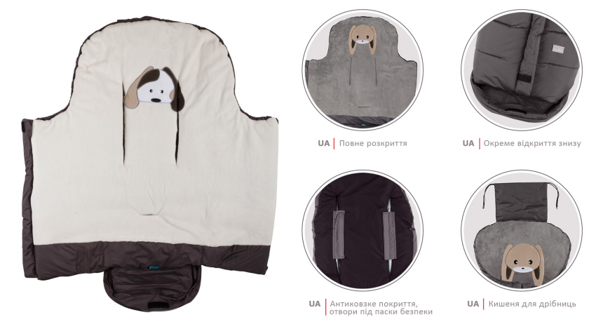 - Адаптивний дизайн дає можливість закріпити конверт у візку, автокріслі тощо. Багато моделей повністю розкладаються в килимок для ігор (під наглядом дорослих).