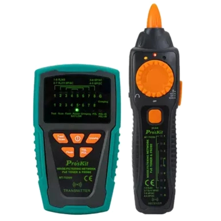 Pro'sKit MT-7029N – це тестер телекомунікаційних мереж та ліній передачі даних, оснащений покращеними потужними інструментами фільтрації шуму. Прилад використовує технологію фільтра високих частот, що усуває шум і захищає від перешкод при трасуванні дротів. Тестер підходить для звичайних мереж, мереж PoE, пошуку кабелів UTP/STP та позиціювання. Він також оснащений функціями, що дозволяють виявляти порти з миготливими сигналами, перевіряти якість обтискання одинарних наконечників і проводити одночасне трасування проводів та прокладання кабельних ліній. Pro'sKit MT-7029N відмінно підходить для встановлення та ремонту телекомунікаційних та комп'ютерних мереж, пристроїв передачі даних, кабельного ТБ тощо.