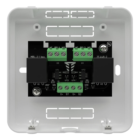 Виносний модуль МРЛ-2.1 BOX призначений для розширення системи пожежної або охоронної сигналізації на два релейних виходи управління автоматикою. Модуль виконаний у власному пластиковому корпусі та відповідає ДСТУ EN 54-18. Два релейні виходи з перекидним контактом; Підключення до транзисторних або релейних виходів ППК; Робота з ППК серій, "Tiras PRIME", "Тірас-П", "Тірас-А", "Orion NOVA II", "Оріон NOVA", БП 1230, БП 2415, ПУіЗ "Тірас-1", та іншими приладами, що містять релейні виходи або виходи "відкритий колектор"; Можливість віддалення від ППК на відстань близько 150 м-коду.