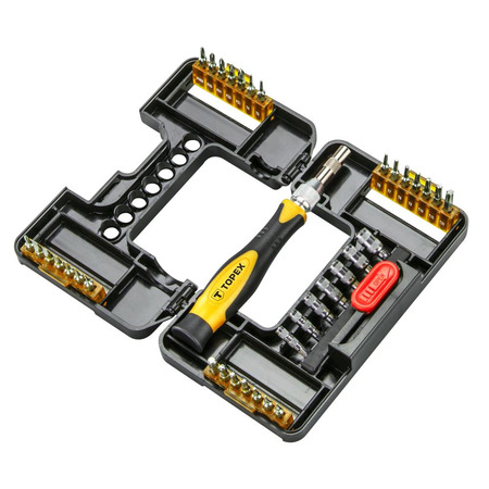 Topex 39D343 - це набір насадок з тримачем, який включає 37 різних насадок різних розмірів і типів, а також тримач для них. Цей набір дозволяє зручно і швидко змінювати насадки на викрутці в залежності від вимог конкретної роботи. Він може містити насадки зірчасті, крестоподібні, шліцеві, шестигранні і інші типи насадок, що робить набір універсальним для різних видів робіт. Такий набір є дуже корисним для ремонтних робіт, монтажу, складських робіт і будь-яких інших завдань, де використовуються викрутки та насадки.