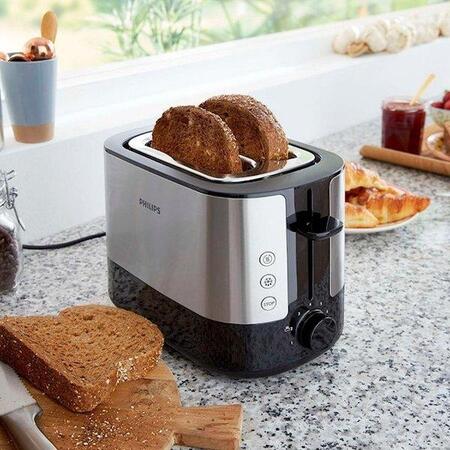 Механізм автоматичного центрування розміщує і тонкі, і вручну нарізані товсті скибочки прямо по центру, фіксуючи їх для рівномірного обсмажування.