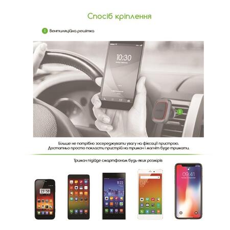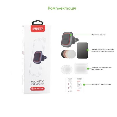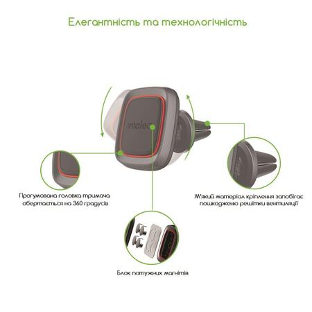 Компактний універсальний автотримач Intaleo CM01GG з вбудованим магнітом зручно й безпечно кріпиться на решітку вентиляції передній панелі авто.