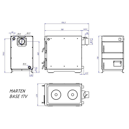 Технічні характеристики твердопаливного котла Marten Base MB-17V: Номінальна потужність котла 17 кВт Опалювальна площа 15-170 м2 Паливо основне/альтернативне антрацит, кам'яне вугілля/дрова Площа поверхні теплообміну в котлі 1.98 м2 ККД, не менше 76 % Тривалість згоряння разового завантаження 5-8 годин Ємність води в котлі 57 л Вага котла без води 150 кг Необхідна тяга димових газів 20-25 Па Температура димових газів при виході з котла 140-220 0С Рекомендована мінімальна температура води 58 0С Максимальна температура води 95 0С Номінальний (максимальний) тиск води 0,25 МПа Випробувальний тиск води, не більше 0,4 МПа Споживання електроенергії, не більше Діаметр патрубків прямої та зворотної води 40 мм Розмір топки Глибина 630 мм Об'єм 70 дм3 Рекомендовані параметри димоходу Площа перерізу 248 м2 Внутрішній діаметр 178 мм Висота (мінімально допустима) 5 м D (х/в) 210/102