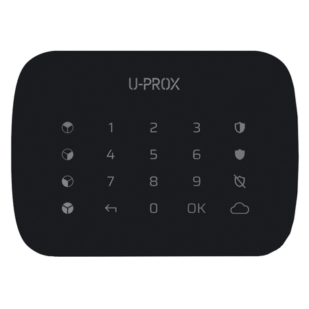 Сенсорна поверхня. Кнопки керування чотирма групами охорони. Звуковий індикатор затримки на вхід та вихід. Чотири літієві батареї ААА. Підсвітка кнопок