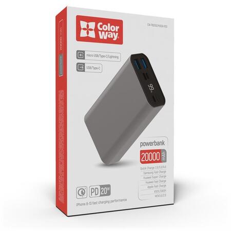 Компактний та функціональний УМБ ColorWay ідеально підійде для подорожей та практично не займає місце у сумці. За допомогою технології швидкого заряджання Quick Charge 3.0 потужністю 20W та Power Delivery Ваш пристрій зарядиться максимально швидко, а захист від перепадів та короткого замикання захистить девайс від негативних наслідків. УМБ оснащений LED-індикатором, завдяки якому Ви зможете контролювати рівень заряду, а ємності в 20000 мАч цілком вистачить для задоволення потреб у зарядці вашого гаджета. Ідеальний аксесуар, який підійде до будь-якого пристрою.