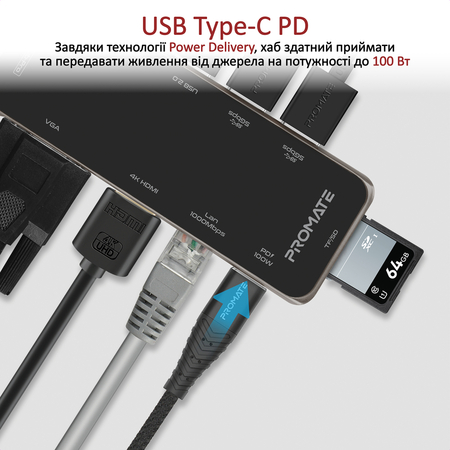 USB Type-C PD: Завдяки технології Power Delivery, хаб може приймати й передавати живлення від джерела на потужності до 100 Вт.