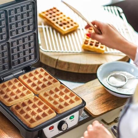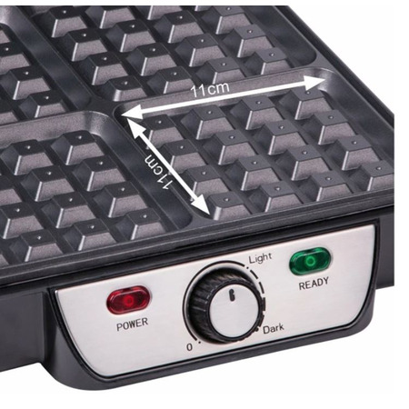 У даній моделі передбачена можливість одночасного приготування 4 шматочків вафель, при цьому розмір робочої поверхні становить 22х22 см. Добре впорається зі своїм завданням передбачене в цій моделі антипригарне покриття, яке не допустить пригорання і полегшить догляд за робочою поверхнею приладу.