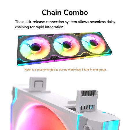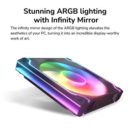 Модульні вентилятори – це шлях у майбутнє: система швидкороз’ємних з’єднань забезпечує просте послідовне з’єднання для швидкої та безпроблемної збірки. Покращені канали повітряного потоку підвищують ефективність та знижують шум за рахунок поділу повітряного потоку на мінімальні потоки. Конструкція нескінченного дзеркала забезпечує динамічні ефекти підсвічування, доповнені світлодіодним оздобленням, що створює безперервний контур. Комбо-ланцюжок Система швидкороз’ємних з’єднань дозволяє здійснювати безшовне послідовне підключення для швидкої інтеграції, гарантуючи оптимальну ефективність повітряного потоку: швидка проста збірка без інструментів, яка дозволяє підтримувати охолодження вашої системи без зайвого клопоту. (Рекомендована конфігурація через ваші обмеження з джерелами живлення - не більше 3 вентиляторів) Гідродинамічні підшипники з PMW Гідродинамічні підшипники (HDB) подовжують термін служби вентилятора та знижують рівень шуму, а технологія управління ШІМ забезпечує точний контроль швидкості обертання вентилятора. Приголомшливе ARGB-підсвічування з Infinity Mirror Дзеркальний дизайн ARGB-підсвічування підвищує естетику вашого ПК, перетворюючи його на неймовірний витвір мистецтва, гідний виставок. Тихий потік Покращені канали повітряного потоку поділяють потік сторони втягування на мінімальні струмені, підвищуючи ефективність та знижуючи шум.