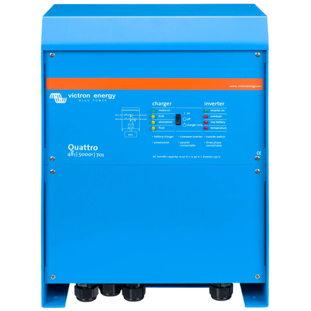 Інвертор VictronEnergy Quattro 48/5000/70-100/100 - це комбінований однофазний пристрій, який поєднує в собі функції інвертора і зарядного пристрою для сонячної батареї. Цей інвертор призначений для використання в сонячних енергетичних системах і має потужність 5000 Вт.