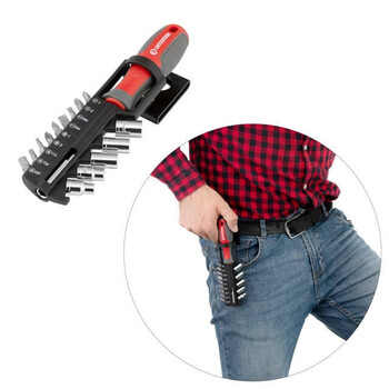 Весь набір запакований у компактний тримач з можливістю кріплення на паску. Біти та головки розташовуються на індивідуальних посадкових місцях, і не випадають. Ви швидко знайдете необхідну насадку завдяки нанесеному маркуванню.