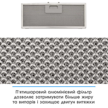 Надійний 5-шаровий алюмінієвий фільтр поглинає жир, бруд, дрібні сторонні частинки й захищає двигун витяжки. Для легкого очищення його достатньо вийняти і помити в гарячій воді чи посудомийній машині.