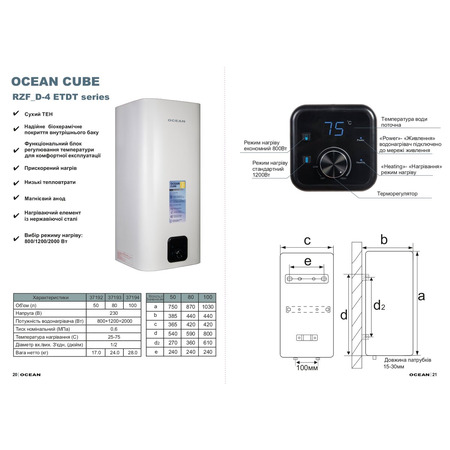 Модель ЕВН CUBE призначена для установки тільки у вертикальному положенні. Конструкція водонагрівача забезпечує заповнення бака водою і її нагрівання в автоматичному режимі. Внутрішній бак водонагрівача виготовлений з високоякісної сталі, витримує значні механічні дії. Для захисту від корозії сталь покрита шаром титанової емалі з підвищеним вмістом титану і хрому , гарантує повний захист навіть від самої жорсткої водопровідної води. Внутрішній бак має спеціальне біосклофарфорове покриття, виконане за технологією Surely, що надійно захищає внутрішню поверхню від корозії. Щільна, екологічно чиста пінополіуретанова теплоізоляціяз (щільність 36 кг/см3 ). яка не містить фреону , надає виробу властивості термоса і забезпечує максимально можливу економічність експлуатації.Регульований термостат подвійного захисту суворо підтримує задану температуру гарячої води і автоматично блокує нагрівач при перегріванні.Запобіжна кришка захищає вузол нагріву від випадкових ушкоджень, Всі кришки виконані з сучасних високоміцних полімерних матеріалів. Це дозволяє легко видаляти пил і вологу з поверхні і запобігає ймовірність ураження електрострумом. Клапан безпеки перешкоджає витоку води до трубопроводу і служить для скидання надлишкового тиску води в баку. Завдяки захисній колбі ТЕНи не схильні до нальоту, не вимагають чищення і служать в середньому набагато довше, а також немає необхідності зливати воду з бака при заміні ТЕНа. На одному фланці встановлено 2 автономних ТЕНа з нержавіючої сталі AISI 316. Потужність нагрівального елементу 2,0 (0,7+1,3) кВт з «мокрим» ТЕНом. Обидва ТЕНи можуть працювати як по черзі, так і одночасно. Одиночний режим дозволяє домогтися економного, але більш тривалого нагрівання води, в той час як два працюючих ТЕНи швидко нагрівають воду. Всі моделі оснащені регулятором потужності, що дозволяє вибрати один з трьох режимів нагріву, а також режим економного нагріву. Вода у водонагрівачі нагрівається до заданої температури. При відкритті крана гарячої води до водонагрівачу знизу через трубку подачі холодної води починає надходити холодна вода. Холодна вода витісняє раніше нагріту воду через трубку відбору гарячої води, що йде з верхньої частини апарату. Таким чином, гаряча вода надходить споживачеві, а знизу водонагрівач заповнюється холодною водою. Нагрівальний елемент (ТЕН) знову починає нагрівати воду до заданої температури. Конструкція водоутримуючого баку перешкоджає перемішуванню шарів холодної і нагрітої води. Завдяки цьому пристрою значно збі льшується коефі ці єнт використання гарячої води і повністю виключаються різкі температурні перепади. Температуру нагрівання (від 30 до 75 С) з інтервалом 1 С. Встановіть необхідну температуру. Відрегулюйте ручку водонагрівача, щоб встановити температуру нагрівання внутрішнього бака. Максимальна температура води встановлена на 75 C. Ручка регулювання температури OFF означає вимкнення живлення, HIGH означає високу температуру. Повертайте ручку за годинниковою стрілкою, щоб збільшити налаштування температури. Після досягнення максимального значення температури ручка більше не повертається. Поступово повертайте ручку проти годинникової стрілки, щоб зменшити налаштування температури. Після досягнення мінімального значення температури, якщо ви продовжите поверт
