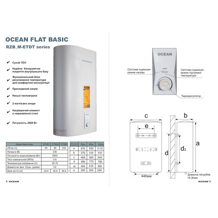 Водонагрівач OCEAN FLAT BASIC- ідеальне рішення автономно організувати подачу гарячої води! Водонагрівачі OCEAN використовуються як для домашнього (квартира, заміський будинок, дача), так і для громадського користування (бари, ресторани, сауни, офіс тощо). Основною перевагою накопичувального електронагрівача є його здатність забезпечити гарячою водою відразу кілька точок водозабору. Компактне рішення для невеликих приміщень, елегантний, сучасний дизайн! Моделі серії FLAT BASIC мають плоску прямокутну форму., 2 баки та 1 тен. Основною перевагою цих моделей є плоский компактний корпус глибиною 26,6-30,6 сантиметрів при обсязі 50-100 літрів, а також швидкий нагрів води. Невелика споживана потужність 2,0 кВт та можливість підключати бойлер в 1-фазну електромережу, що особливо важливо для міських квартир, які мають обмеження в споживанні (по потужності) електроенергії. Вкрай низькі теплові втрати через корпус водонагрівача, дозволяють цілодобово зберігати воду гарячою. Це досягається ефективною теплоізоляцією пінополіуретаном з щільністю 36 кг/см3. Внутрішній бак водонагрівача виготовлений з високоякісної сталі, товщиною2мм, витримує значні механічні дії. Для захисту від корозії сталь покрита шаром титанової емалі з підвищеним вмістом титану і хрому, гарантує повний захист навіть від самої жорсткої водопровідної води. Внутрішній бак має спеціальне біосклофарфорове покриття, виконане за технологією Surely, що надійно захищає внутрішню поверхню від корозії. Щільна, екологічно чиста пінополіуретанова теплоізоляція, яка не містить фреону, надає виробу властивості термоса і забезпечує максимально можливу економічність експлуатації. Регульований термостат подвійного захисту суворо підтримує задану температуру гарячої води і автоматично блокує нагрівач при перегріванні. Запобіжна кришка захищає вузол нагріву від випадкових ушкоджень. Всі кришки виконані з сучасних високоміцних полімерних матеріалів. Це дозволяє легко видаляти пил і вологу з поверхні і запобігає ймовірність ураження електрострумом. Клапан безпеки перешкоджає витоку води до трубопроводу і служить для скидання надлишкового тиску води в баку. Замінюваний магнієвий анод забезпечує внутрішній захист від електрохімічної корозії Щоб встановити температуру нагрівання внутрішнього бака відрегулюйте ручку водонагрівача. Максимальна температура води встановлена на 75 ° C. Ручка регулювання температури «OFF» означає вимкнення живлення, HIGH означає високу температуру. Повертайте ручку за годинниковою стрілкою, щоб збільшити налаштування температури. Після досягнення максимального значення температури ручка більше не повертається. Поступово повертайте ручку проти годинникової стрілки, щоб зменшити налаштування температури. Після досягнення мінімального значення температури, якщо ви продовжите повертати ручку температури води, водонагрівач припинить нагрівання. Весь електричний блок, включаючи ТЕН, термостат і замінний магнієвий анод зібраний на сталевому фланці, який кріпиться до бака за допомогою потужних болтів. Нагрівання води у моделях з позначкою DT (сухий тен) здійснюється за рахунок СУХОГО ТЕНу з нержавіючої сталі AISI 316, який поміщений в спеціальну захисну колбу і не контактує з водою. Завдяки захисній колбі ТЕНи не схильні до нальоту, не вимагають чищення і служать в с