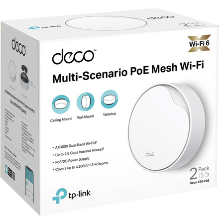 Дводіапазонний Wi-Fi AX3000 – 2402 Мбіт/с (5 ГГц) + 574 Мбіт/с (2,4 ГГц). Кілька варіантів встановлення – Розмістіть його на столі або встановіть на стелі чи стіні за допомогою адаптивних аксесуарів. Підтримується PoE – Живлення через Ethernet для спрощеного розгортання мережі. Дротова мережа Multi-Gig 2,5 Гбіт/с – 1х Порт 2,5 Гбіт/с + 1х Гігабітний порт. Безшовна Mesh-мережа на основі штучного інтелекту – Інтелектуально вивчає ваше мережеве середовище, щоб забезпечити ідеальний Wi-Fi, унікальний для вашого дому. TP-Link HomeShield – Забезпечує повний захист мережі, надійний батьківський контроль і безпеку IoT приладів у реальному часі. Універсальна сумісність – Зворотна сумісність із усіма поколіннями Wi-Fi і працює з будь-яким постачальником послуг Інтернету (ISP) і модемом. Налаштування простіше, ніж будь-коли – Програма Deco крок за кроком проведе вас через налаштування.