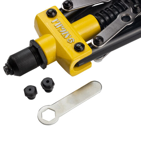Кулачки виготовлені з хромомолібдена, що гарантує тривалий термін експлуатації. Трикулачкова конструкція забезпечує надійний рівномірний зажим заклепки. У комплект входять насадки під різні діаметри заклепок і ключ для їх заміни. Перед з'єднанням, у деталях, що скріплюються, потрібно просвердлити наскрізний отвір, щоб вийшов мінімальний зазор між діаметром отвору та діаметром циліндра заклепки. Таким чином, заклепувальний шов вийде більш щільним.