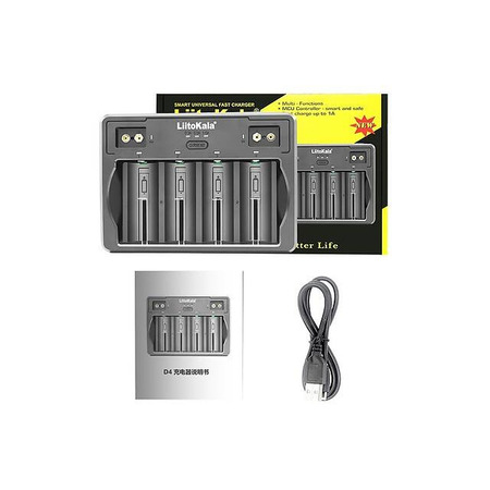 Універсальний зарядний пристрій LiitoKala Lii-D4 – зарядний пристрій на 4 канали для заряду циліндричних акумуляторів і 2 канали для заряду крон 9В зі зручним керуванням однією кнопкою якої можна вибрати струм заряду, з можливістю одночасно розміщувати 4 акумулятори формату D. Автоматично розпізнається нікель-металгідридні та нікель-кадмієві акумулятори, що має 4 + 2 слотів для заряду і може одночасно заряджати від 1 до 4 циліндричних акумуляторів різного хімічного складу і практично всіх типорозмірів акумуляторів АА, ААА, С (R14), D (R14), D , 16340, 18350, 18650, 21700, 20700, 26650, 32700 та інші. Також має два слоти для заряду акумуляторів у форматі 6F22 крона. Відмінні риси та переваги Lii-D4: – заряджає акумулятори у 4+2 незалежних каналах; - Може заряджати акумулятори типу крона 9V; – одночасно можна заряджати 4 акумулятори формату D або 32700; - Заряджає Li-Ion, NiCd, NiMH. - Встановлення акумуляторів довжиною до 72мм; - Активація повністю розряджених акумуляторів; - Виявлення несправних акумуляторів.