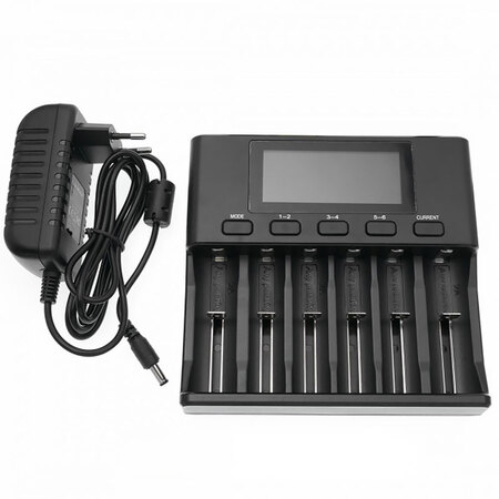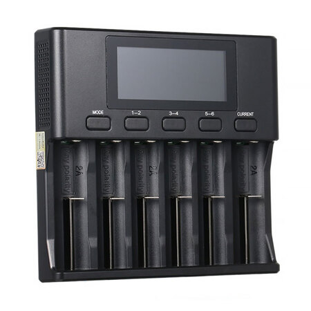 Універсальний зарядний пристрій з 6 незалежними каналами для акумуляторів Ni-MH/ Ni-Cd/Li-ion/LiFePO4, цифровим LED дисплеєм, вибором струму заряду, м’ягким стартом і автоматичним визначенням полярності встановлених елементів. Живлення від мережі ~ 220V або DC 12V.