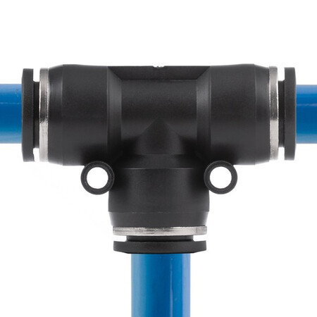 Цангове з'єднання T-подібної форми використовується для створення пневматичних магістралей і для монтажу пневмосистем. Забезпечує повністю герметичне з'єднання різних пневматичних шлангів без пошкодження їхньої поверхні (PU, PE, PA) - поліуретанових, поліетиленових, поліамідних тощо.