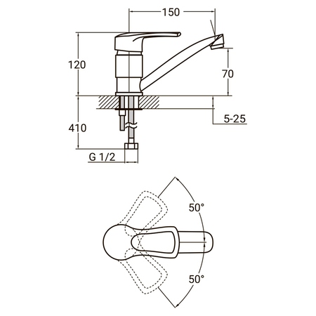 Установка змішувача для кухні Акватика виконується на горизонтальну поверхню, підстава фіксується шпилькою. Для підключення крана до водопроводу в комплекті є гнучкі підводи.
